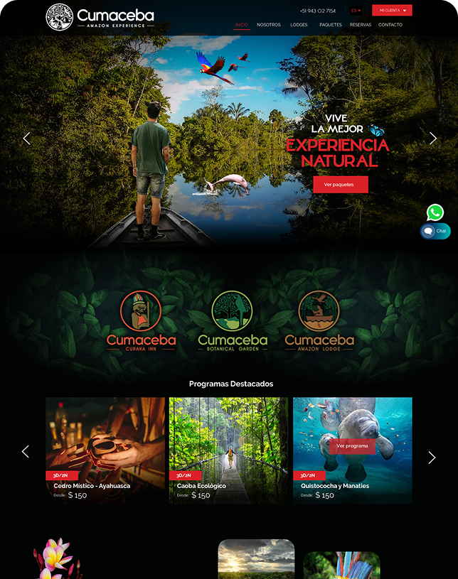 Para Cumaceba, diseñamos y desarrollamos un sitio web que captura y comunica la esencia de una experiencia turística única en la Amazonía peruana. El sitio presenta de forma clara y visual los albergues ecológicos, paquetes de viaje y actividades disponibles desde Iquitos hacia la selva amazónica, resaltando la biodiversidad, los paisajes naturales y la oferta de experiencias inmersivas en la región.
