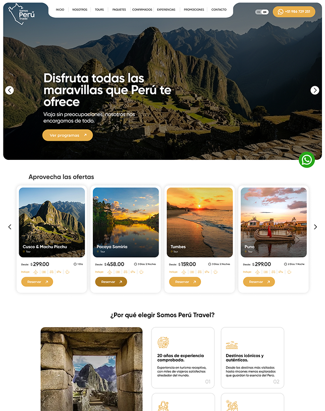 Para Somos Perú Travel, desarrollamos una plataforma web a medida para una agencia especializada en turismo receptivo en el Perú, con más de 13 años de trayectoria. El proyecto incluyó el desarrollo de plugins personalizados, la creación de etiquetas dinámicas para la clasificación de paquetes y la diferenciación de tipos de tours, facilitando una gestión ordenada y flexible de su oferta turística.